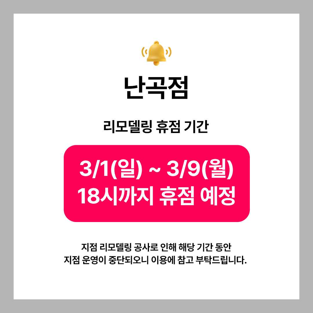 🔹 난곡점 : 3월 1일(일)~3/9(월) 18시까지 휴점 예정
