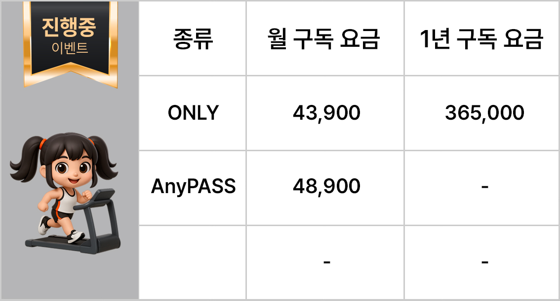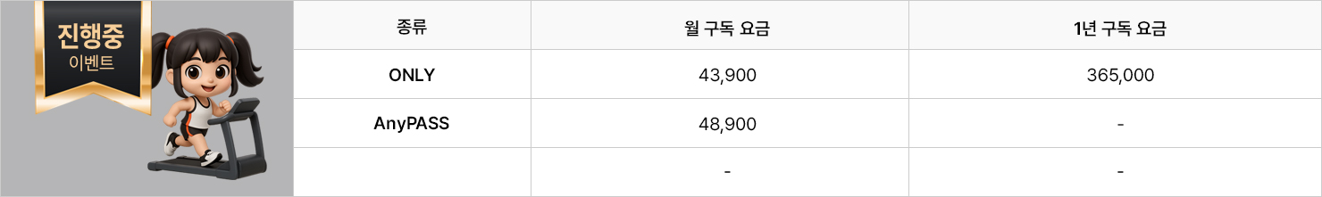 | 운동복 대여 | ONLY : 9,900 / AnyPASS : 4,900 | 118,00 -> 49,000 | ||